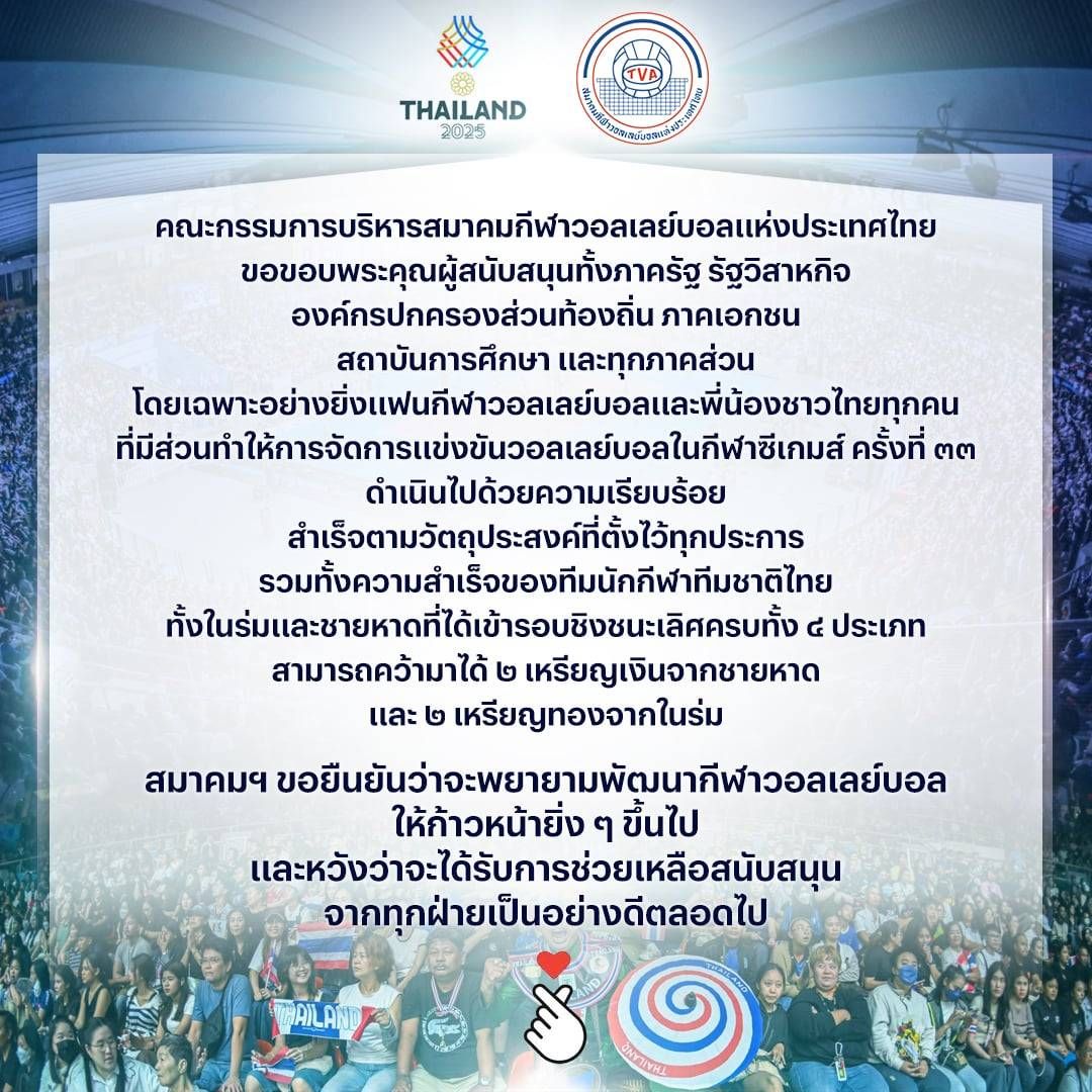 คณะกรรมการบริหารสมาคมกีฬาวอลเลย์บอลแห่งประเทศไทย ขอขอบพระคุณผู้สนับสนุนทั้งภาครัฐ รัฐวิสาหกิจ สถาบันการศึกษา และทุกภาคส่วน โดยเฉพาะอย่างยิ่งแฟนกีฬาวอลเลย์บอลและพี่น้องชาวไทยทุกคน ที่มีส่วนทำให้การแข่งขันวอลเลย์บอลในกีฬาซีเกมส์ ครั้งที่ 33 ดำเนินไปด้วยความเรียบร้อย สำเร็จตามวัตถุประสงค์ที่ตั้งไว้ทุกประการ รวมทั้งความสำเร็จของทีมนักกีฬาทีมชาติไทย ทั้งในร่มและชายหาดที่ได้เข้าชิงชนะเลิศครบทั้งสี่ประเภท สามารถคว้ามาได้สองเหรียญเงินจากชายหาดและสองเหรียญทองจากในร่ม