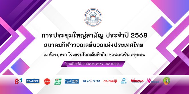 สมาคมกีฬาวอลเลย์บอลแห่งประเทศไทย กำหนดจัดประชุมใหญ่สามัญสมาคมกีฬาวอลเลย์บอลแห่งประเทศไทย ประจำปี 2568 ในวันจันทร์ที่ 30 มีนาคม 2569 เวลา 11.00 น. ณ ห้องบุหงา โรงแรมโกลเด้นทิวลิป ซอฟเฟอริน กรุงเทพ