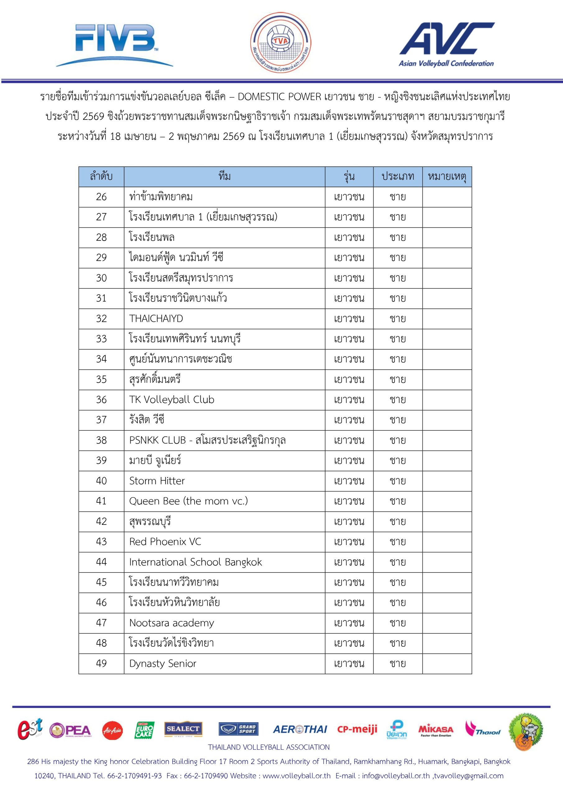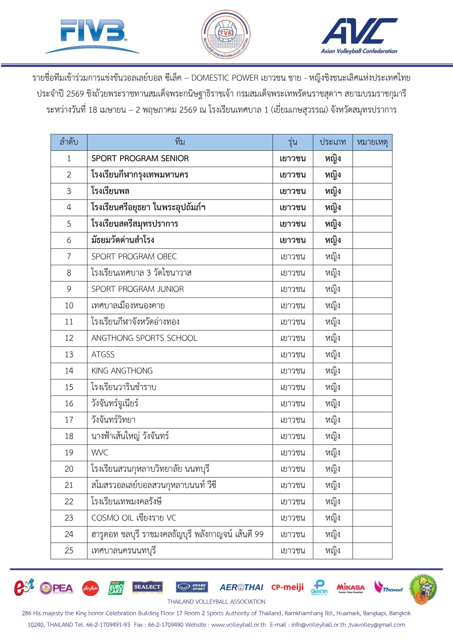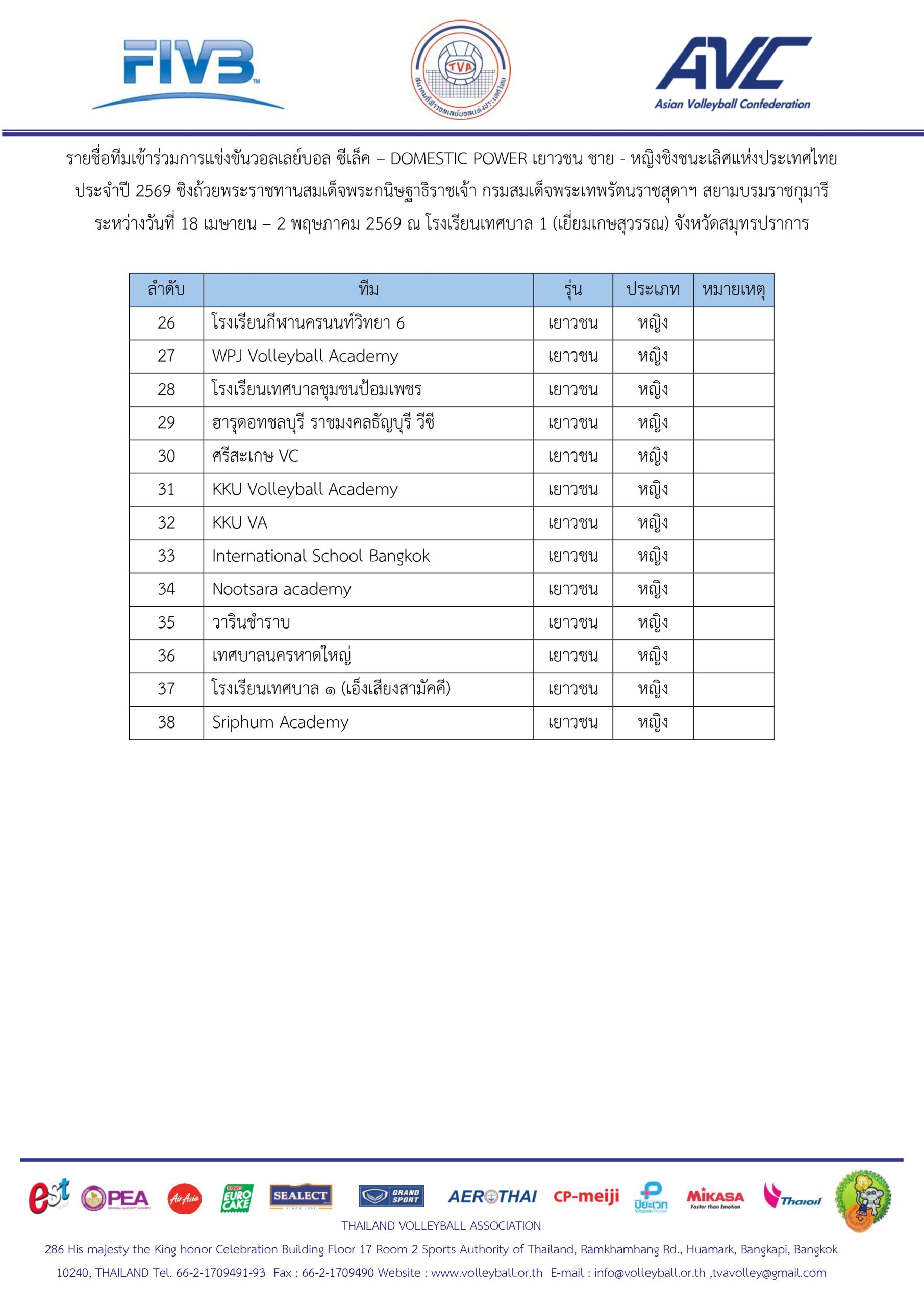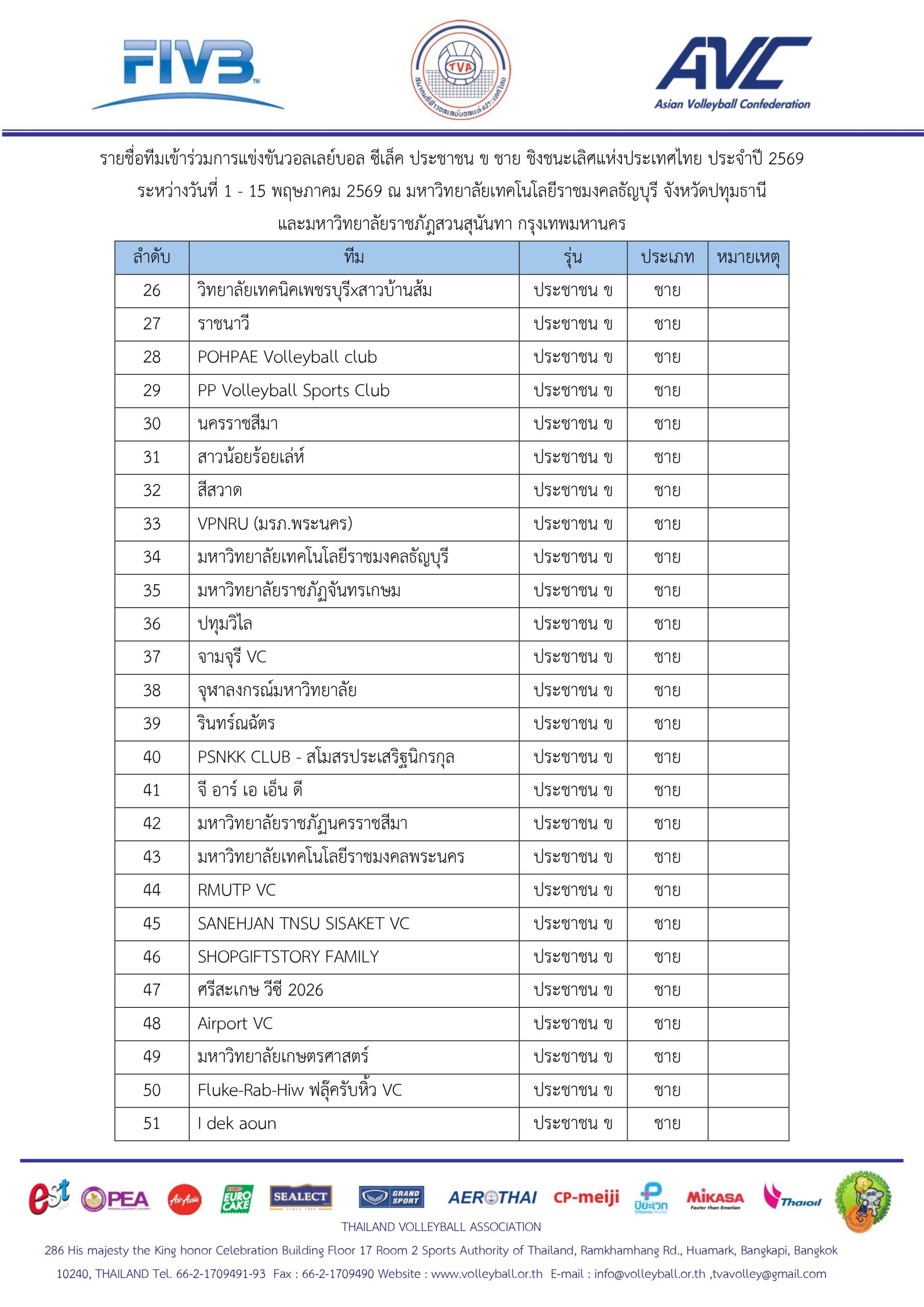 รายชื่อทีมเข้าร่วมการแข่งขันวอลเลย์บอล ซีเล็ค – DOMESTIC POWER เยาวชน ชาย – หญิง ชิงชนะเลิศแห่งประเทศไทย ประจำปี 2569 และรายชื่อทีมเข้าร่วมการแข่งขันวอลเลย์บอล ซีเล็ค ประชาชน ข ชาย ชิงชนะเลิศแห่งประเทศไทย ประจำปี 2569