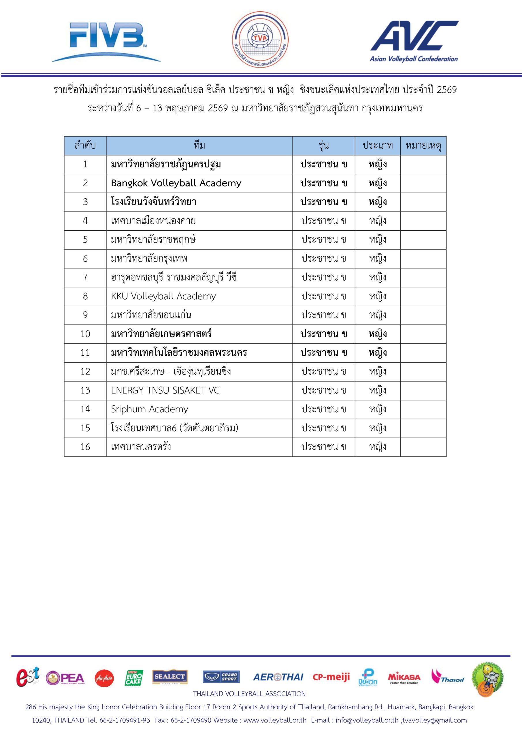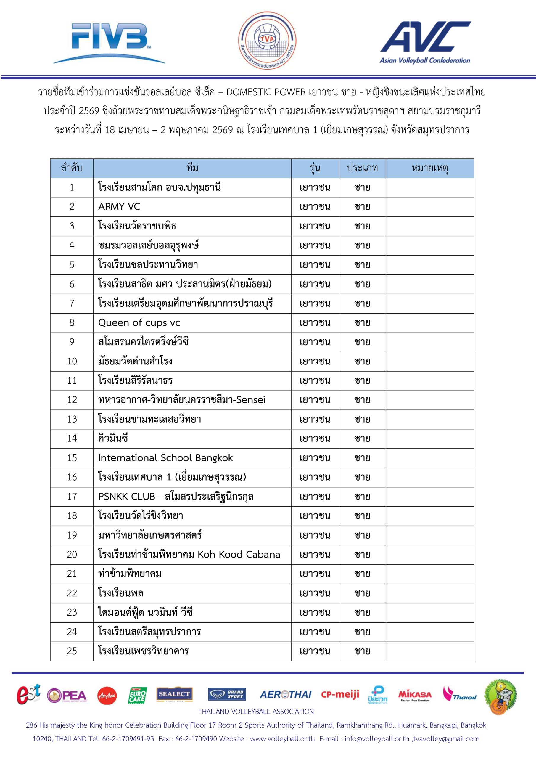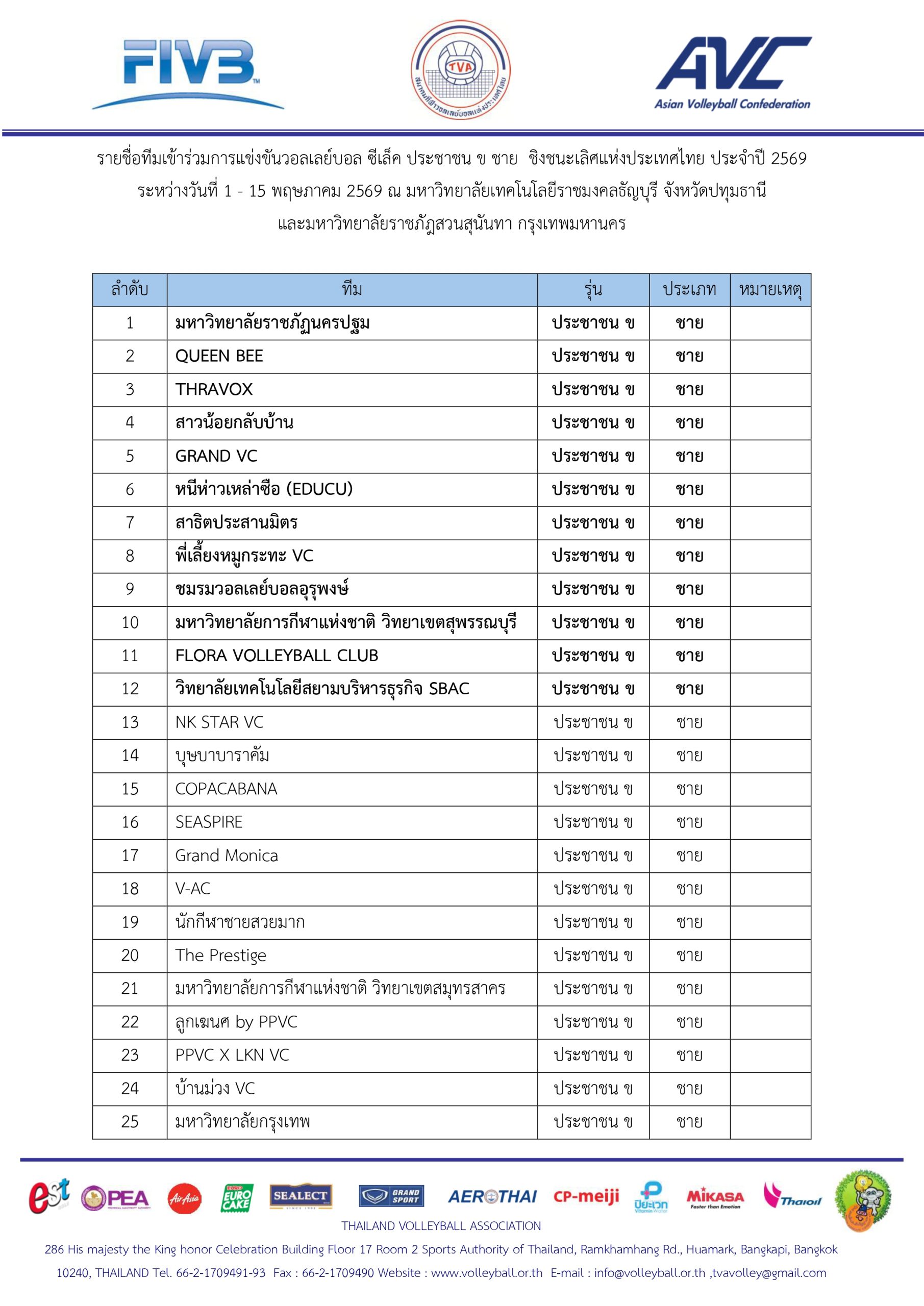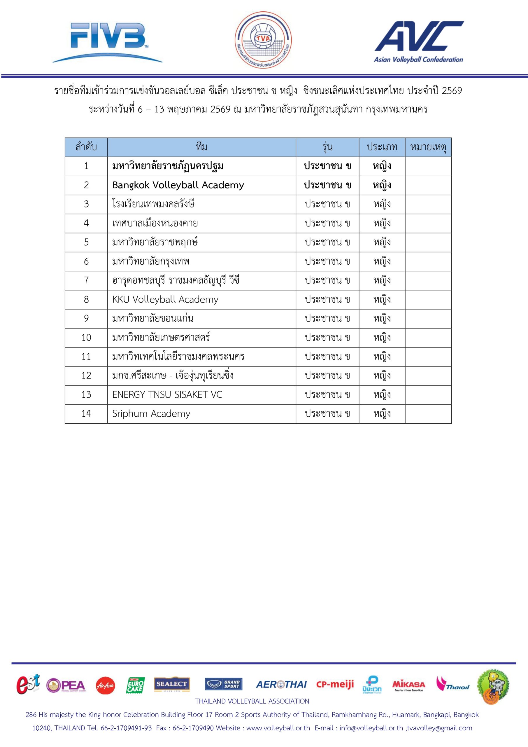 รายชื่อทีมเข้าร่วมการแข่งขันวอลเลย์บอล ซีเล็ค – DOMESTIC POWER เยาวชน ชาย – หญิง ชิงชนะเลิศแห่งประเทศไทย ประจำปี 2569 และรายชื่อทีมเข้าร่วมการแข่งขันวอลเลย์บอล ซีเล็ค ประชาชน ข ชาย ชิงชนะเลิศแห่งประเทศไทย ประจำปี 2569