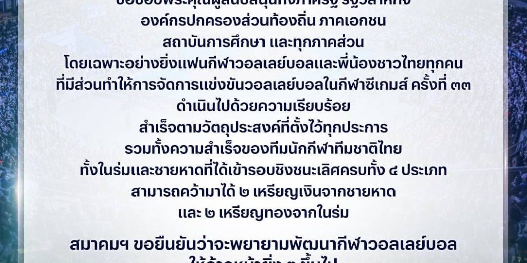 คณะกรรมการบริหารสมาคมกีฬาวอลเลย์บอลแห่งประเทศไทย ขอขอบพระคุณผู้สนับสนุนทั้งภาครัฐ รัฐวิสาหกิจ สถาบันการศึกษา และทุกภาคส่วน โดยเฉพาะอย่างยิ่งแฟนกีฬาวอลเลย์บอลและพี่น้องชาวไทยทุกคน ที่มีส่วนทำให้การแข่งขันวอลเลย์บอลในกีฬาซีเกมส์ ครั้งที่ 33 ดำเนินไปด้วยความเรียบร้อย สำเร็จตามวัตถุประสงค์ที่ตั้งไว้ทุกประการ รวมทั้งความสำเร็จของทีมนักกีฬาทีมชาติไทย ทั้งในร่มและชายหาดที่ได้เข้าชิงชนะเลิศครบทั้งสี่ประเภท สามารถคว้ามาได้สองเหรียญเงินจากชายหาดและสองเหรียญทองจากในร่ม สมาคมขอยืนยันว่าจะพยายามพัฒนากีฬาวอลเลย์บอลให้ก้าวหน้ายิ่งยิ่งขึ้นไป และหวังว่าจะได้รับการช่วยเหลือสนับสนุนจากทุกฝ่ายเป็นอย่างดีตลอดไป